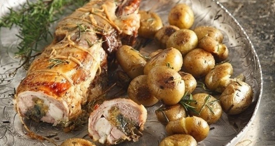 Τυλίγουμε το κρέας σε ρολό. Αν έχουμε σπάγκο, που καλό είναι να έχουμε, δένουμε μερικές φορές το κρέας για να μην ανοίξει. Τυλίγουμε το κρέας με το χαρτί και το αλουμινόχαρτο και το βάζουμε σε προθερμασμένο φούρνο στους 185°C στον αέρα για 2 ώρες. Εναλλακτικά, αν δεν έχουμε σπάγκο, τυλίγουμε το κρέας σφιχτά με τη βοήθεια του αλουμινόχαρτου και του χαρτιού. Προσέχουμε όμως κατά τη μεταφορά του στον φούρνο.
