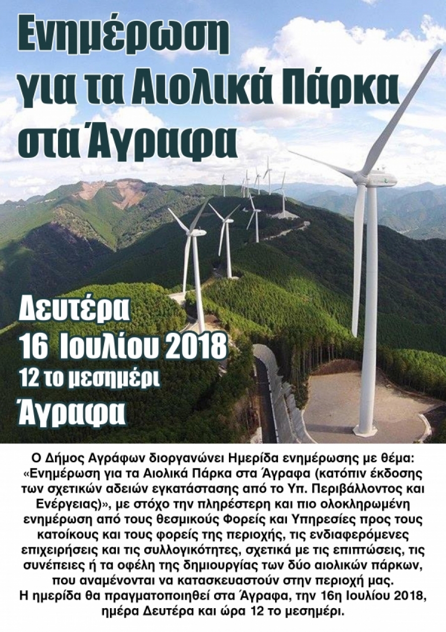 Ημερίδα ενημέρωσης για τα αιολικά που πρόκειται να κατασκευαστούν στις βουνοκορφές των Αγράφων διοργανώνεται αύριο 16 Ιουλίου , ημέρα Δευτέρα και ώρα 12 το μεσημέρι στο χωριό των Αγράφων.