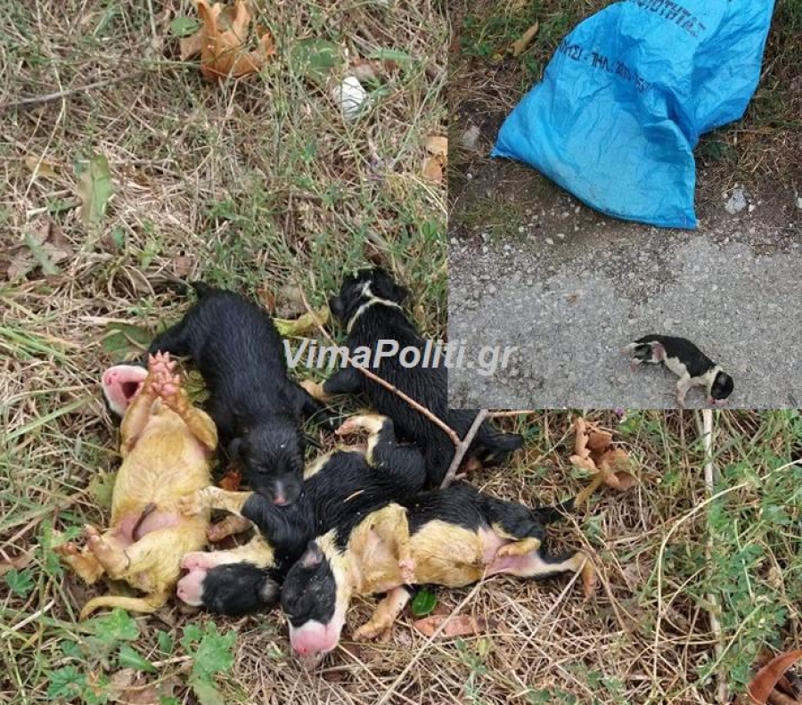 Οι φωτογραφίες με τα επτά νεογέννητα κουτάβια μέσα σ’ ένα τσουβάλι δεμένο και πεταμένο σε χωράφι κοντά στο Καρπενήσι διαδόθηκαν στο διαδίκτυο προκαλώντας σοκ στους χρήστες και κατοίκους.